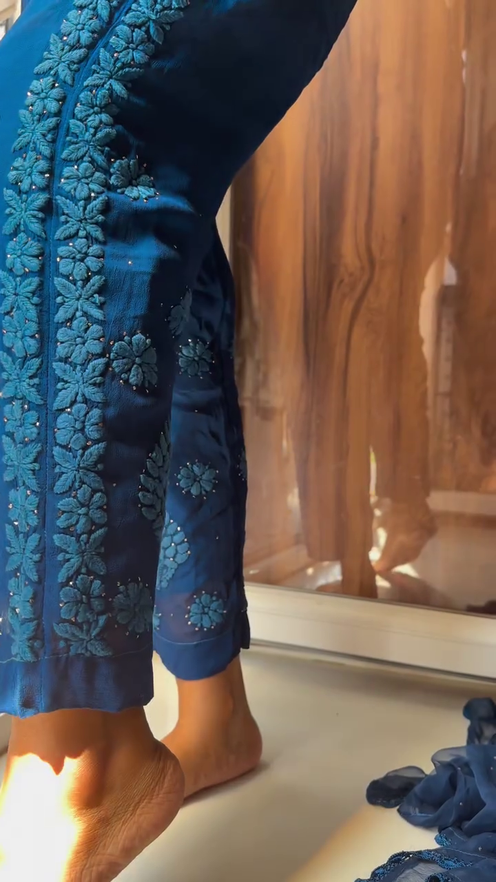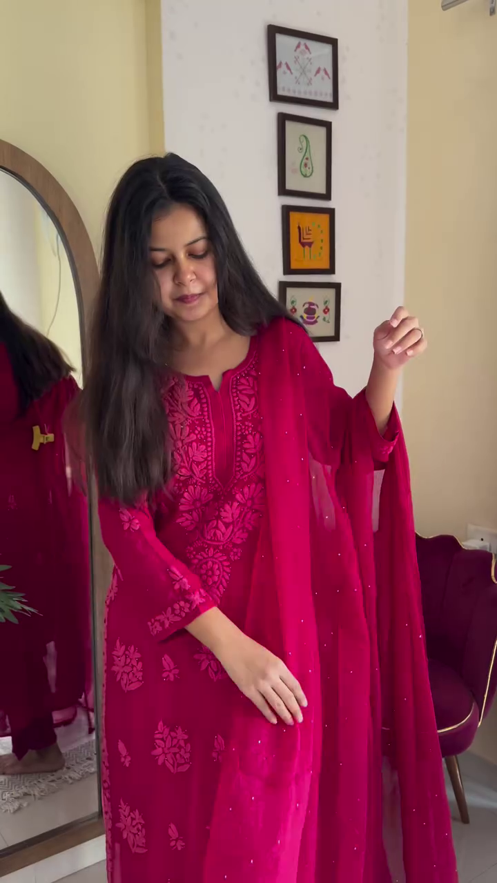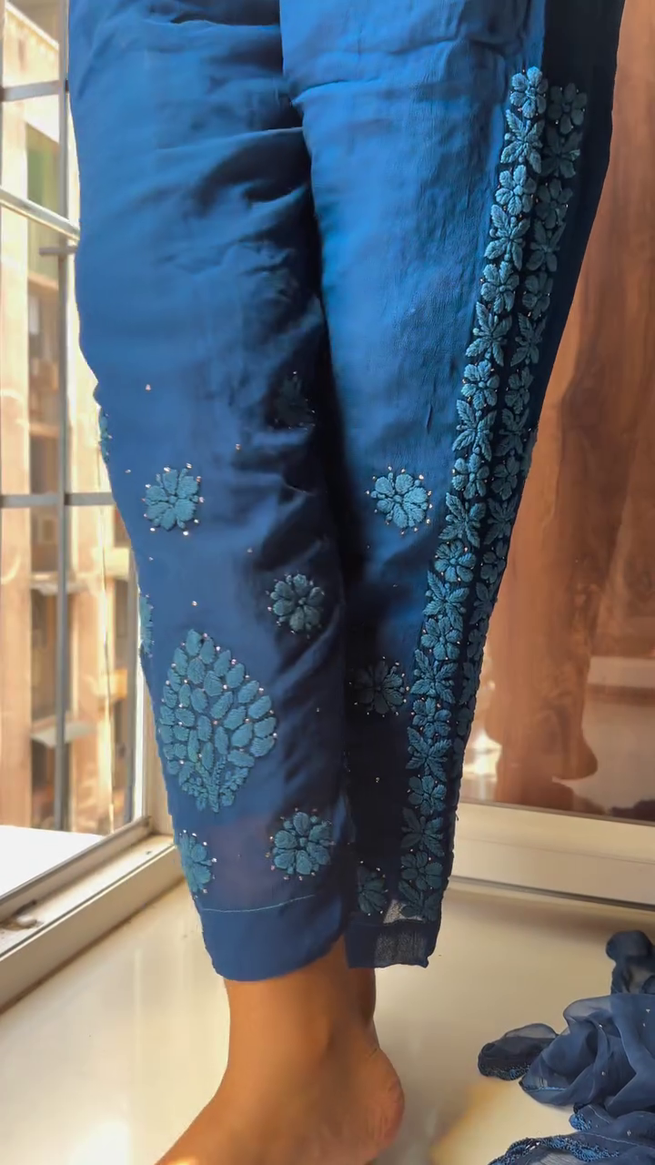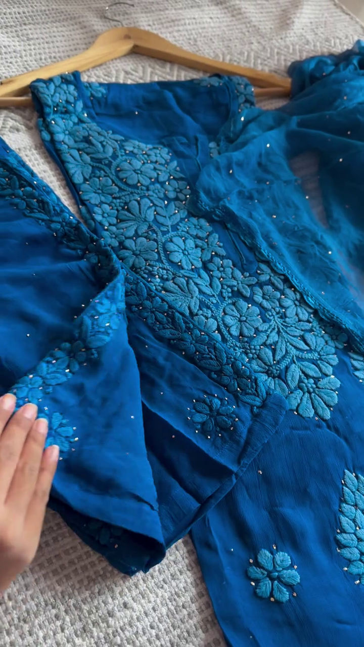 Every set is meticulously hand-dyed and embroidered, with slight variations in motifs that reflect the artisanal handwork involved—making each piece truly one-of-a-kind. The soft, flowy georgette fabric ensures effortless grace while keeping you comfortable through long celebrations and joyful family gatherings.