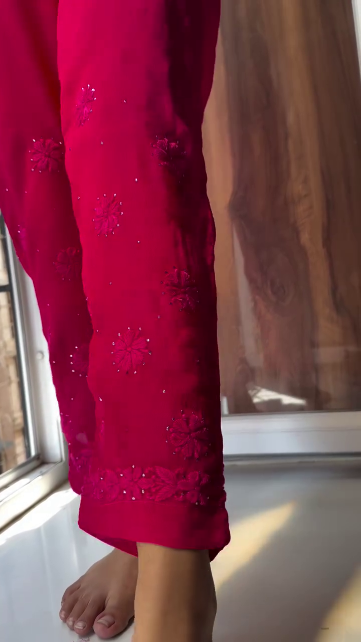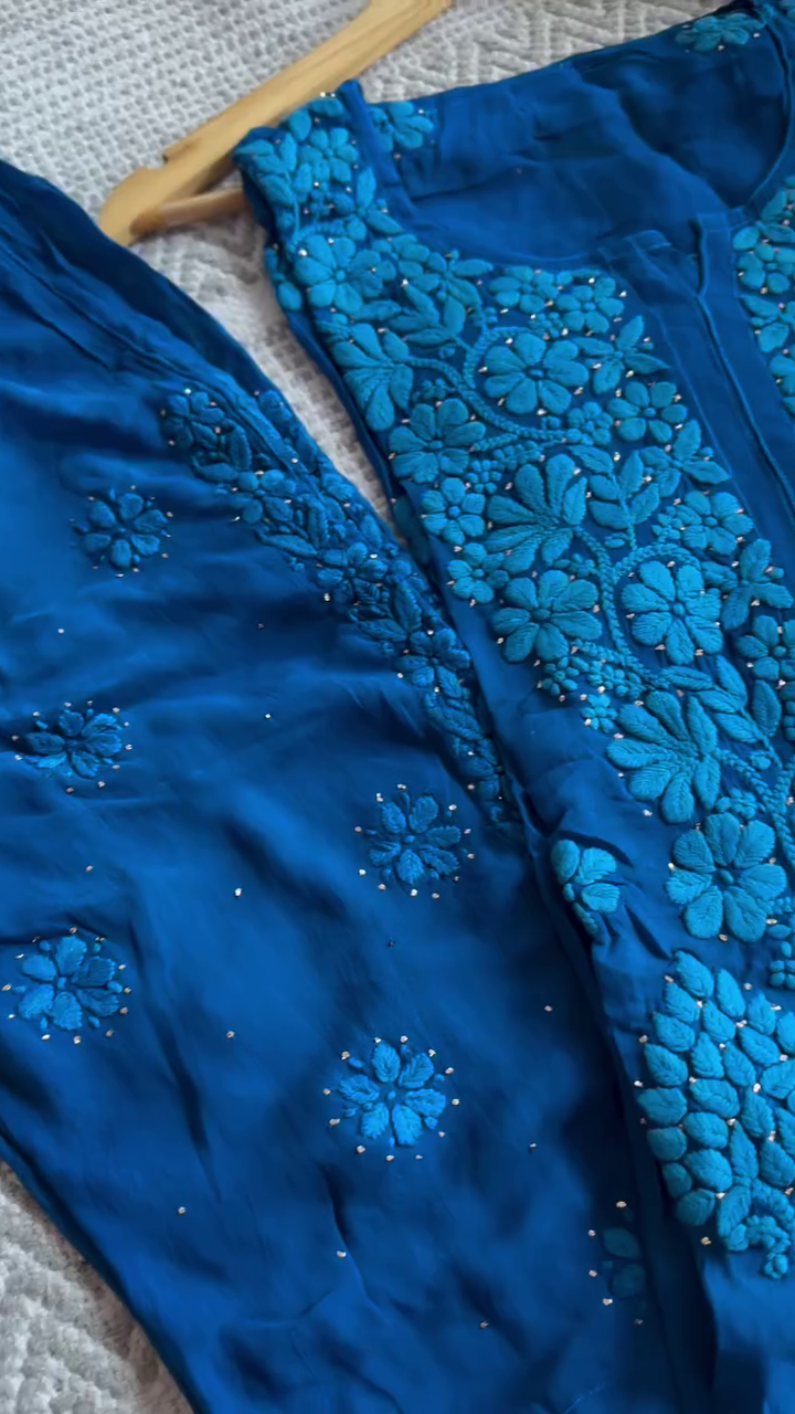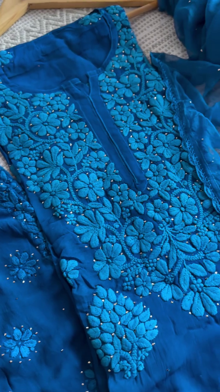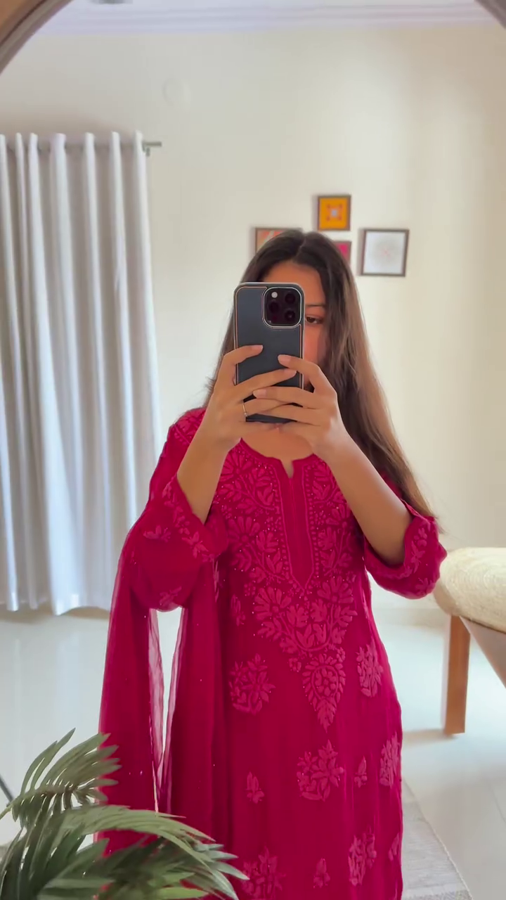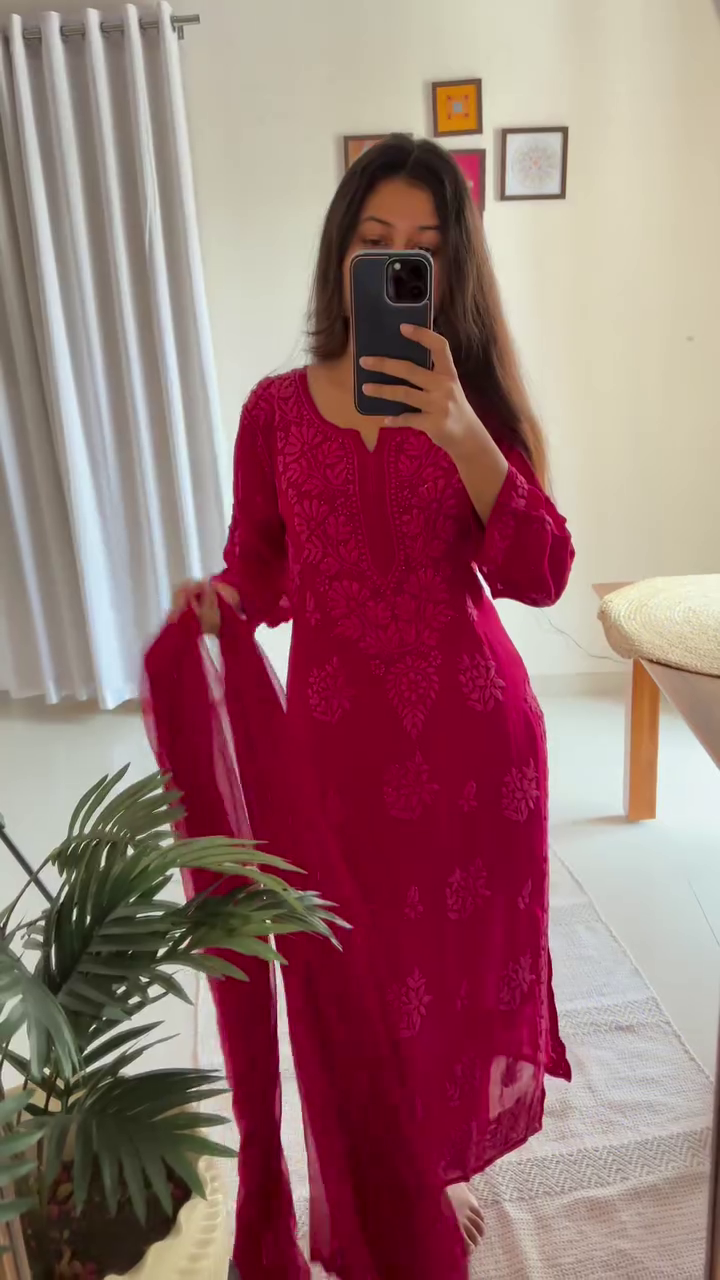 Every set is meticulously hand-dyed and embroidered, with slight variations in motifs that reflect the artisanal handwork involved—making each piece truly one-of-a-kind. The soft, flowy georgette fabric ensures effortless grace while keeping you comfortable through long celebrations and joyful family gatherings.