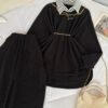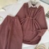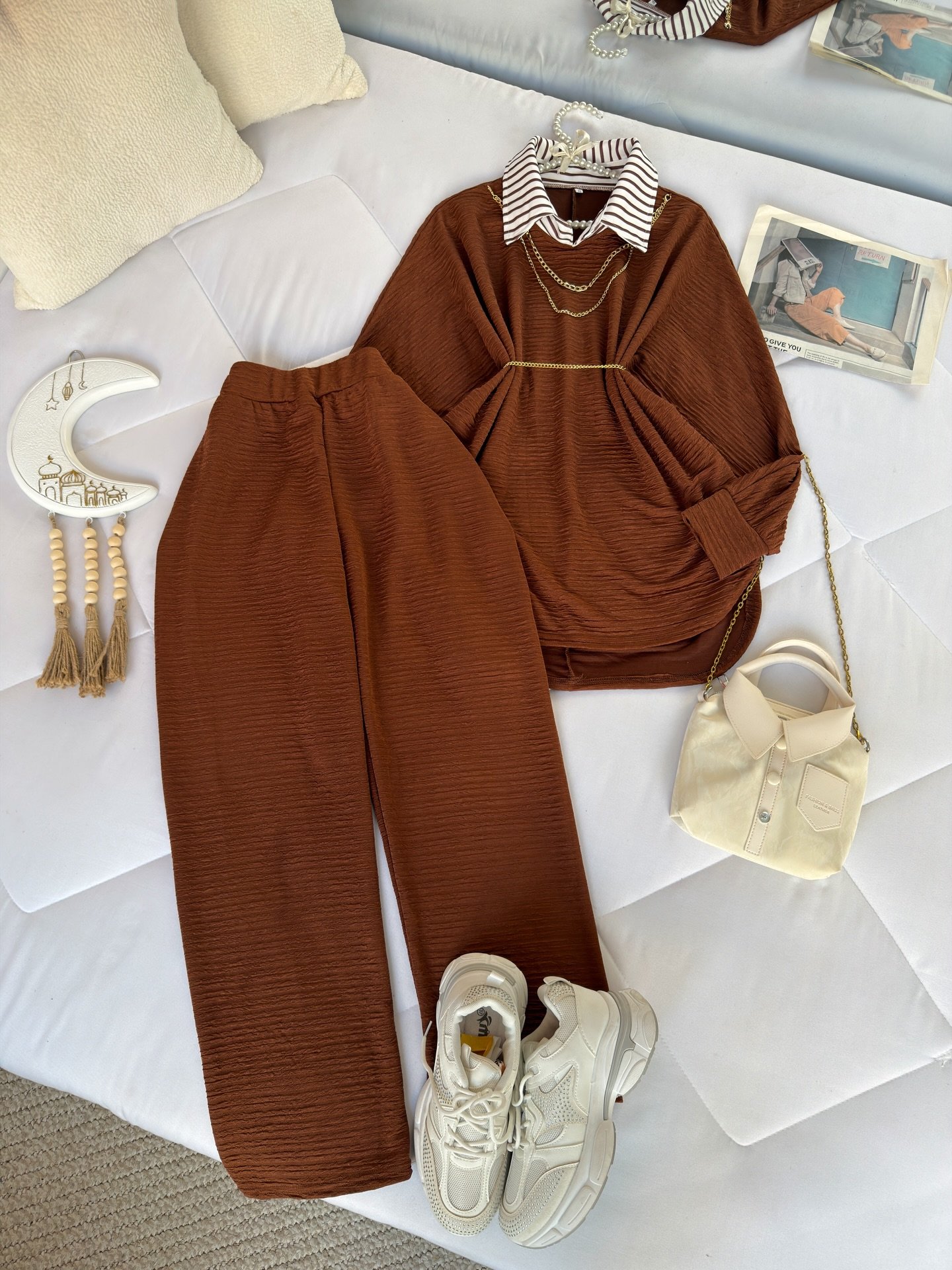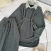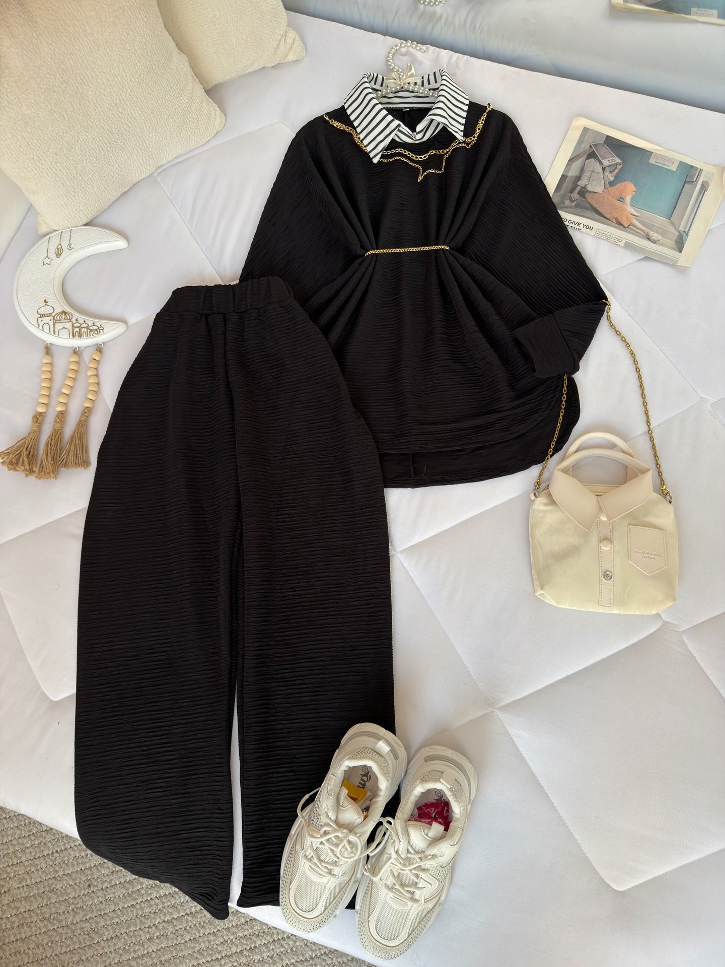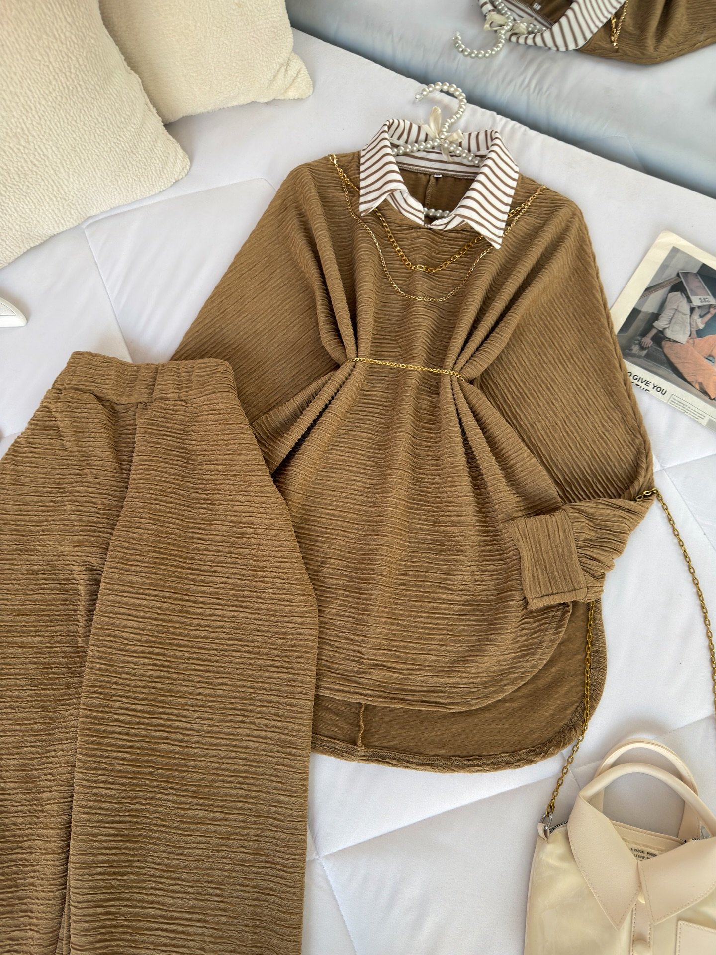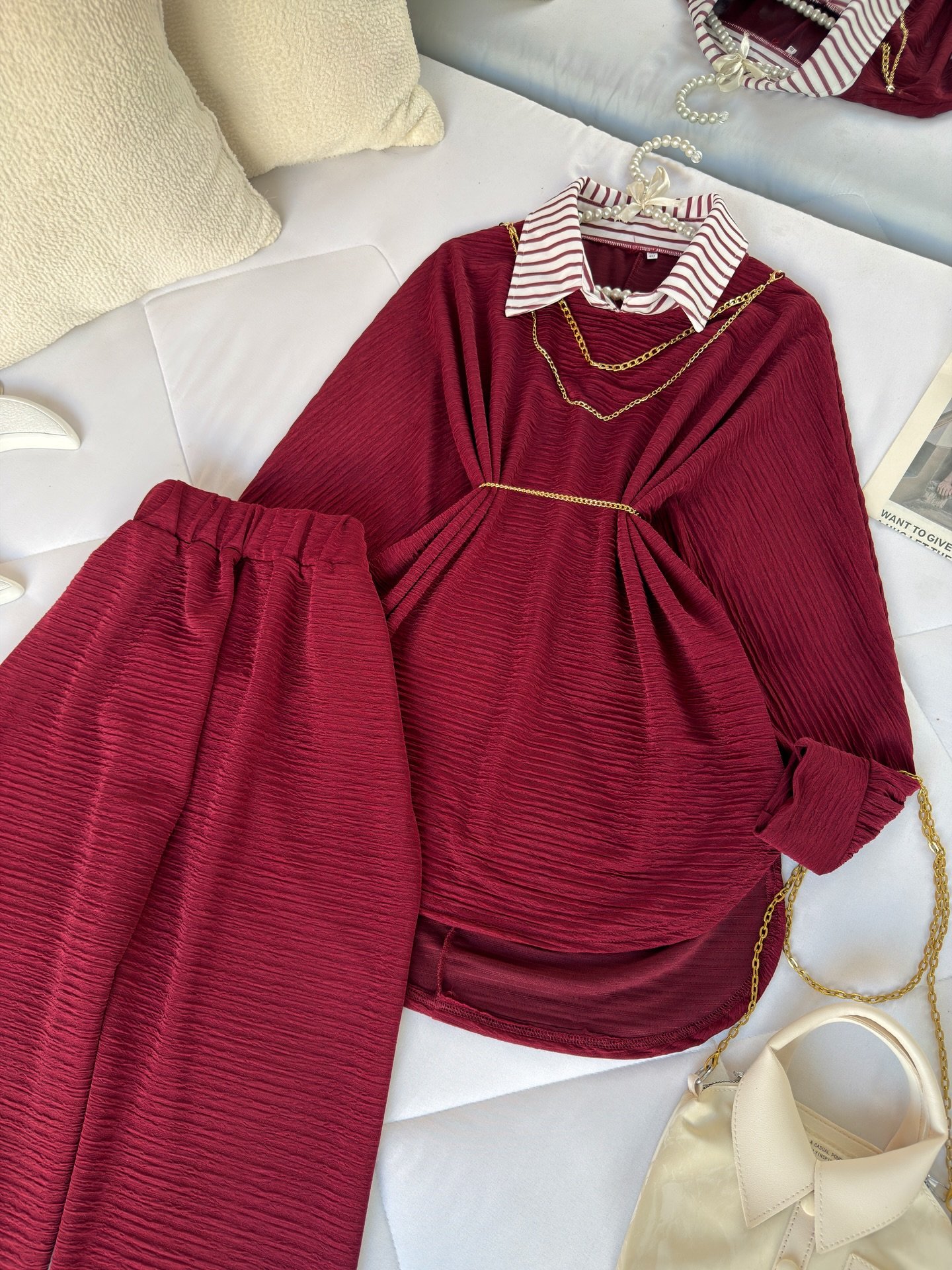 The top features a soft crinkled texture that adds depth and dimension to the look 🌿 Styled with a built-in striped collar insert, it gives the illusion of smart layering without the extra bulk. A delicate gold chain detail around the neckline enhances the overall aesthetic, while the slim waist belt beautifully cinches the silhouette for a flattering fit ✨ The relaxed, flowy cut ensures all-day comfort while keeping your look polished and refined.