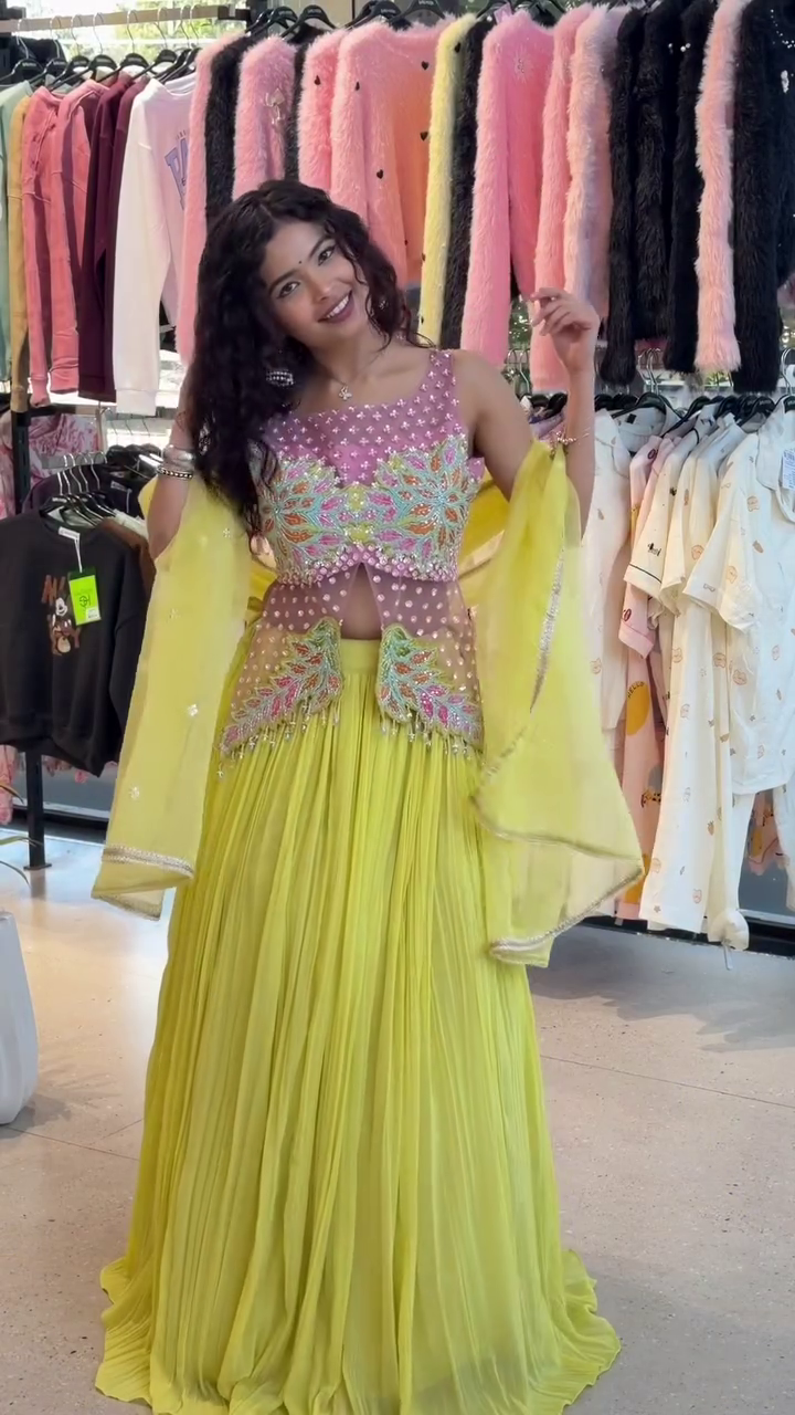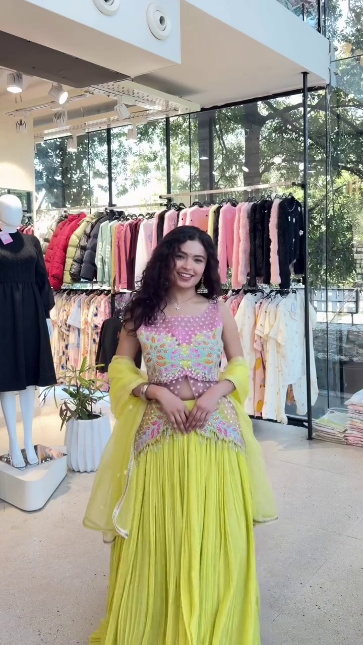Paired with the top is a flowy, pleated lehenga skirt that moves like a dream π Crafted from lightweight, breathable fabric, the skirt creates a soft, elegant drapeβperfect for twirling through celebrations and long festive evenings. Completing the look is a sheer, matching dupatta, adding an extra layer of elegance and sophistication πΏ