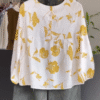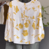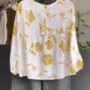 The top features a soft white base adorned with delicate mustard floral prints, exuding freshness and charm. Its balloon sleeves add a graceful silhouette, while the front button detailing and flowy tiered hem give it a relaxed, breezy appeal. Crafted from premium, breathable cotton, this top feels feather-light on your skin, making it ideal for warm days, brunch dates, or casual outings. ๐ธ