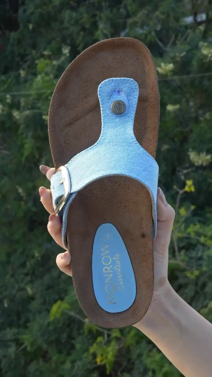 Featuring a stylish denim-finish toe-ring strap, these sandals add a modern yet laid-back vibe to your look πŸ’™ The soft strap sits comfortably on the foot, offering a secure fit without causing discomfort. A subtle metallic accent adds a refined touch, elevating the overall design while keeping it versatile and easy to style ✨