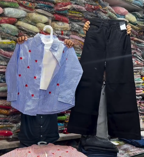 Paired with black wide-leg pants, the outfit offers a flattering silhouette with freedom of movement. The wide-leg design balances the fitted shirt, creating a modern, relaxed look that works well for casual, semi-formal, or street-style ensembles. An elastic waistband or tailored fit ensures all-day comfort without compromising style.