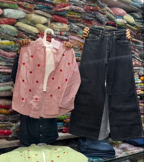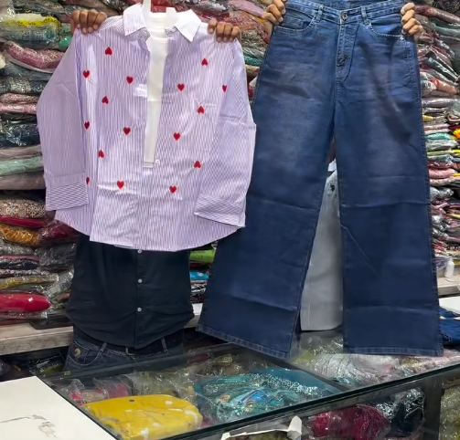 The blue and white striped shirt is the star of the outfit, with its classic stripes contrasted by charming red heart embroidery on the chest. This subtle detail adds personality and a trendy twist to a timeless pattern. The inner shirt is crafted from soft, breathable fabric, ensuring comfort while maintaining a polished, put-together look.
