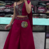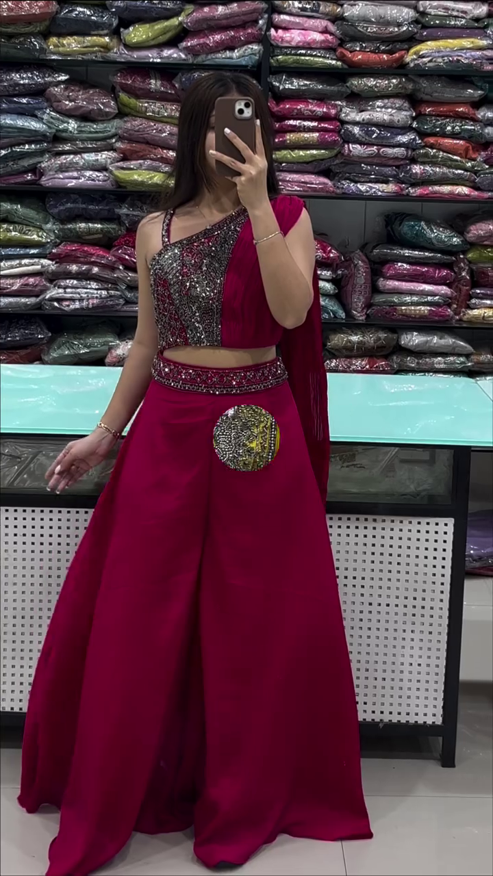 The set features a beautifully embellished one-shoulder crop top, highlighted with intricate sequin and thread detailing that catches the light with every move β¨ The unique asymmetrical design adds a bold, contemporary touch while still keeping the look elegant and festive. The soft pleated drape on one side enhances the silhouette and adds graceful movement π