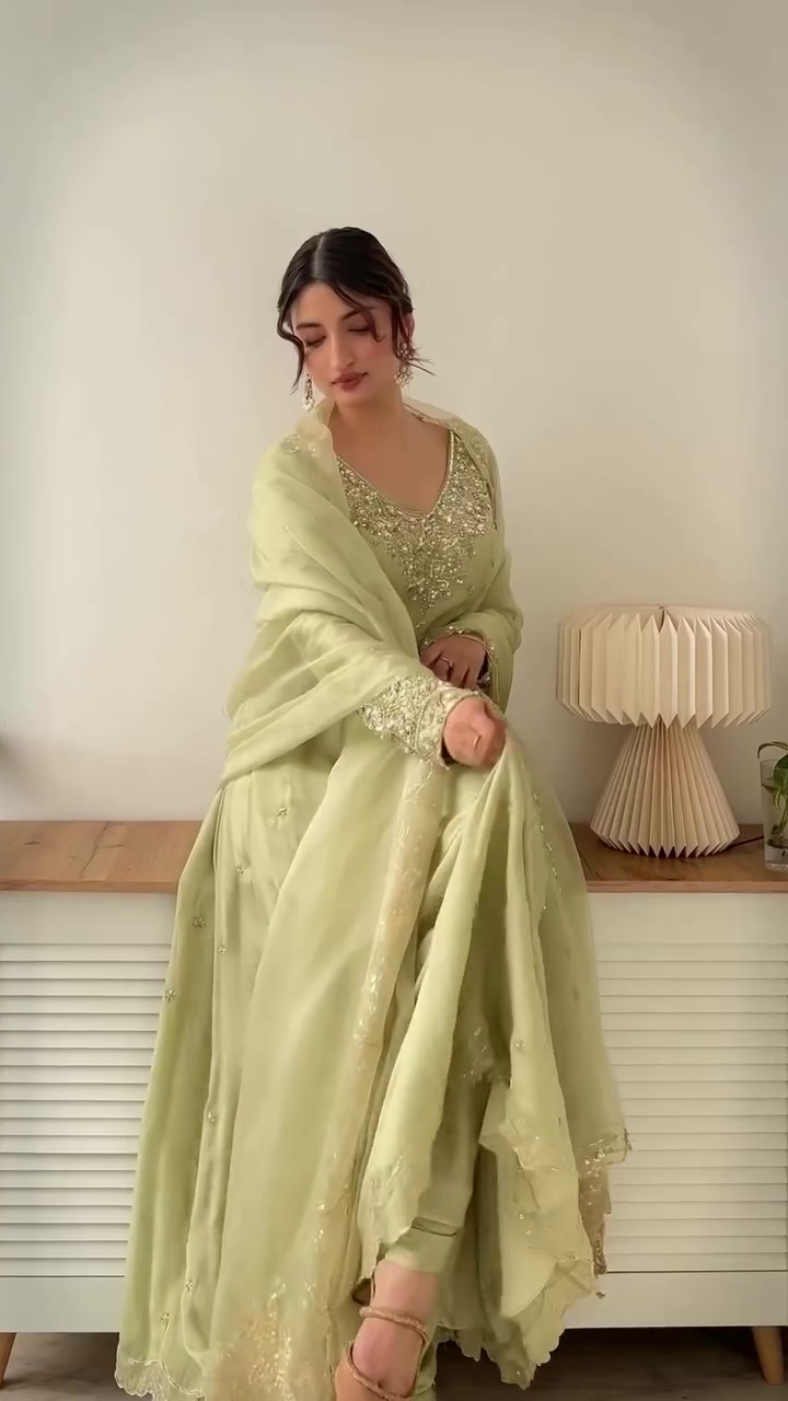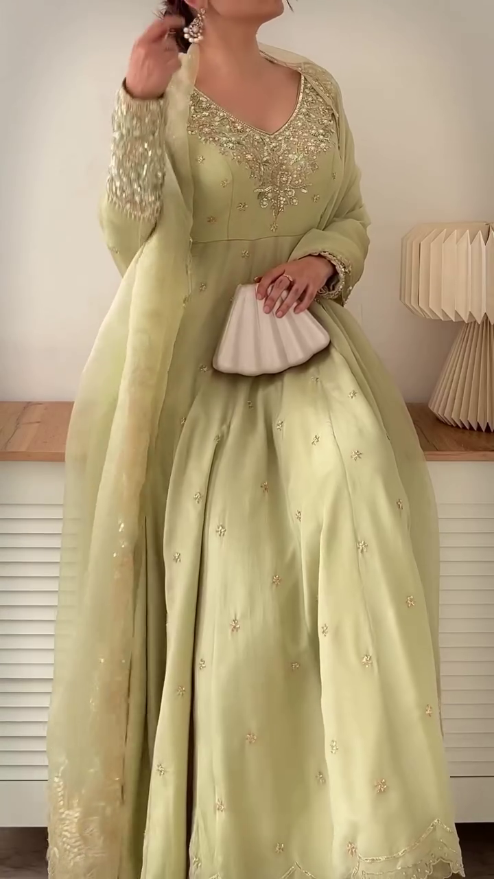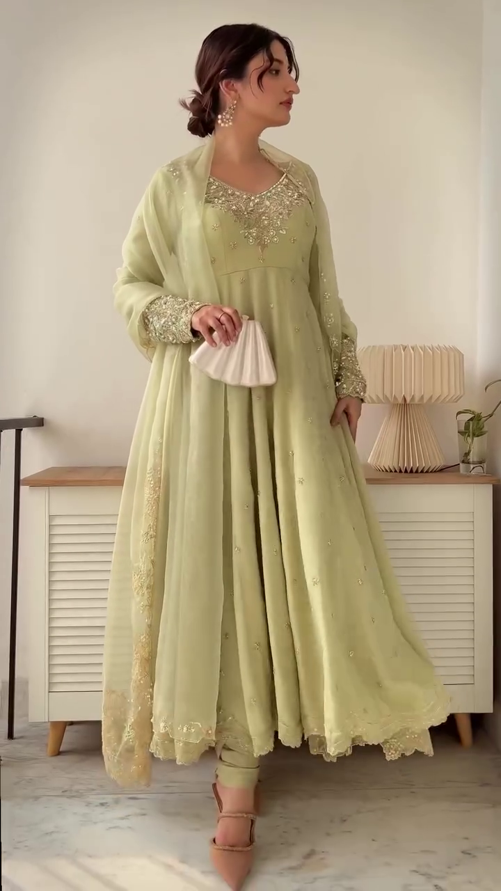 💫 Ethnic Elegance in Pastel Green with Gold Work 🌸