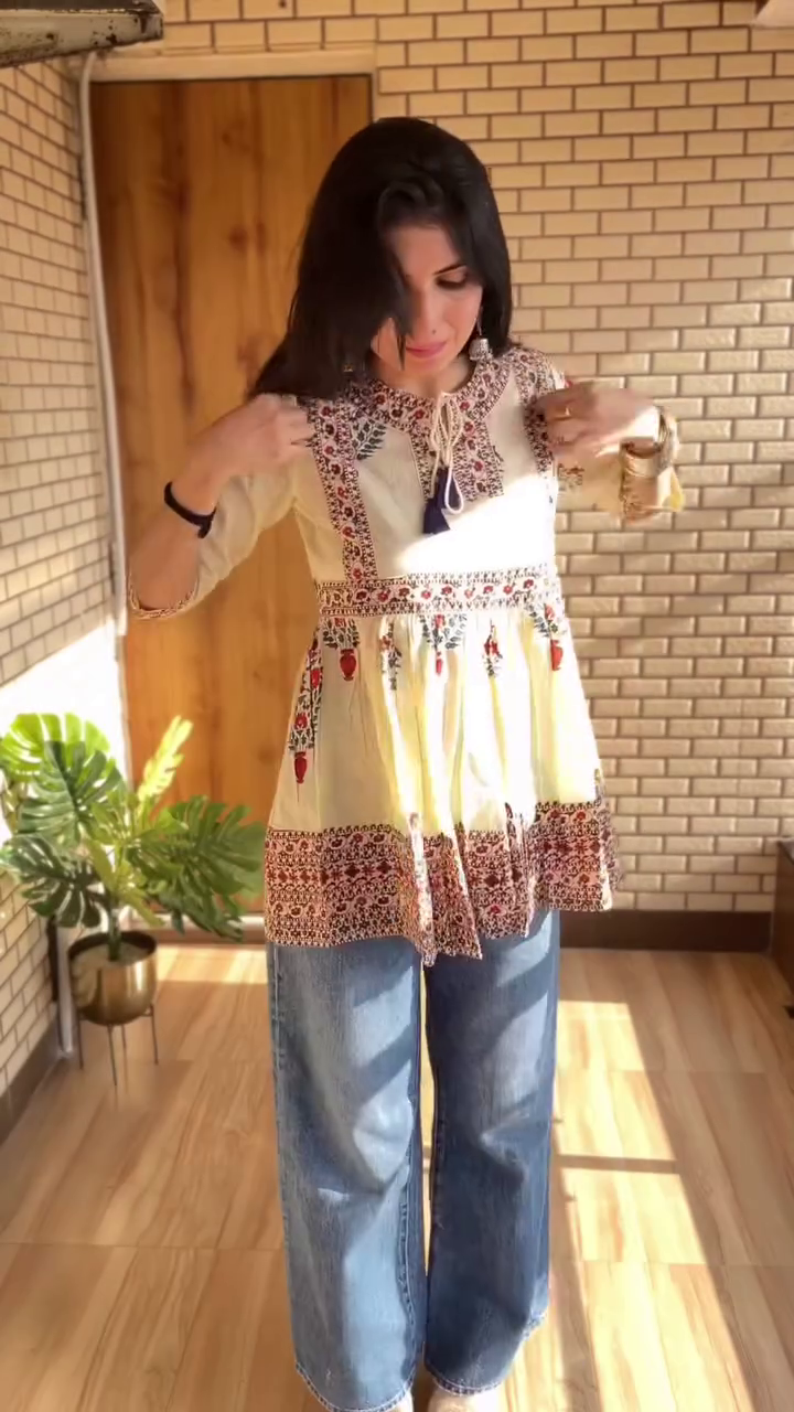 The embroidery is the true highlight of this tunic. Featuring a burst of colorful floral and geometric patterns, each stitch is carefully handcrafted by skilled artisans, ensuring a unique design for every piece. This meticulous detailing celebrates the richness of traditional embroidery techniques while infusing the tunic with a modern, wearable aesthetic. The vibrant hues blend harmoniously, making the top an ideal statement piece for both day and evening wear.