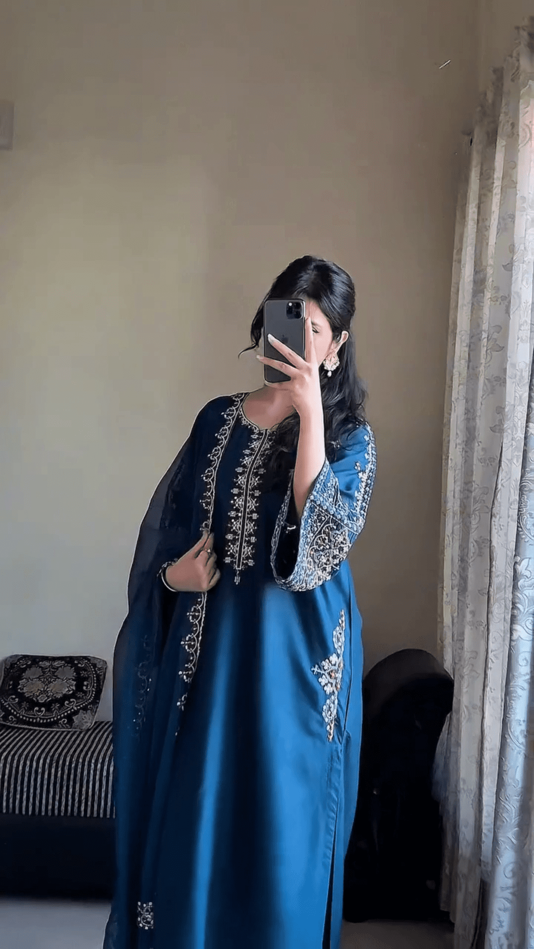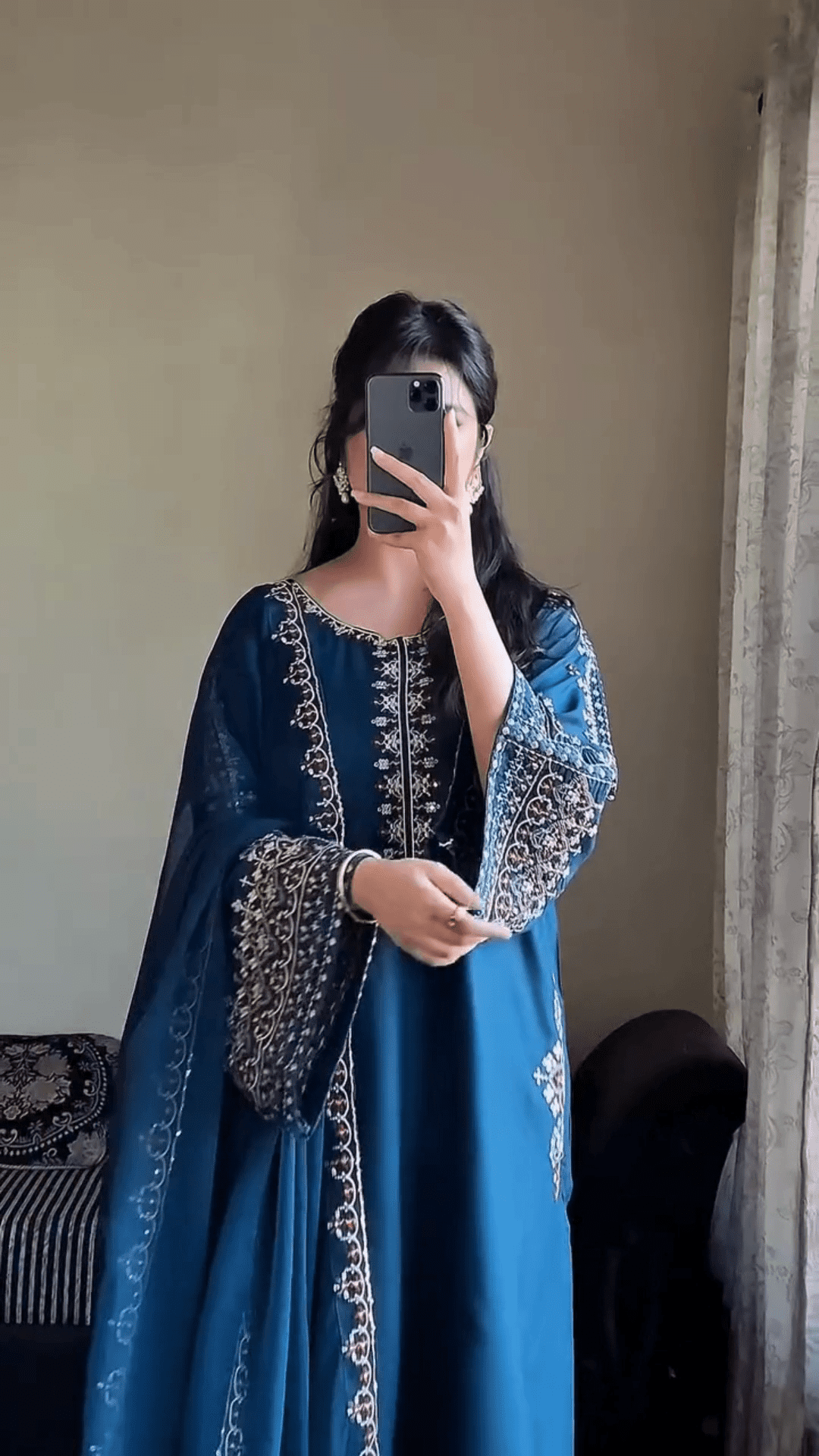 Pair This Outfit With Traditional Jhumkas, Bangles, And Comfortable Kolhapuri Sandals Or Juttis. Opt For A Low Bun Or Soft Waves To Enhance The Ethnic Appeal. Add A Bindi And Light Makeup For A Complete Desi Diva Look.