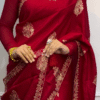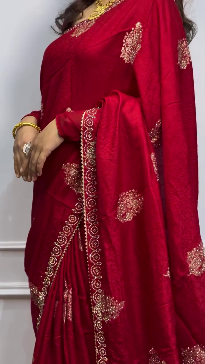 - Jewelry: Pair with traditional gold jewelry, Kundan, or Polki sets to complement the rich look of the saree.