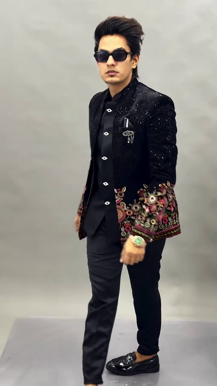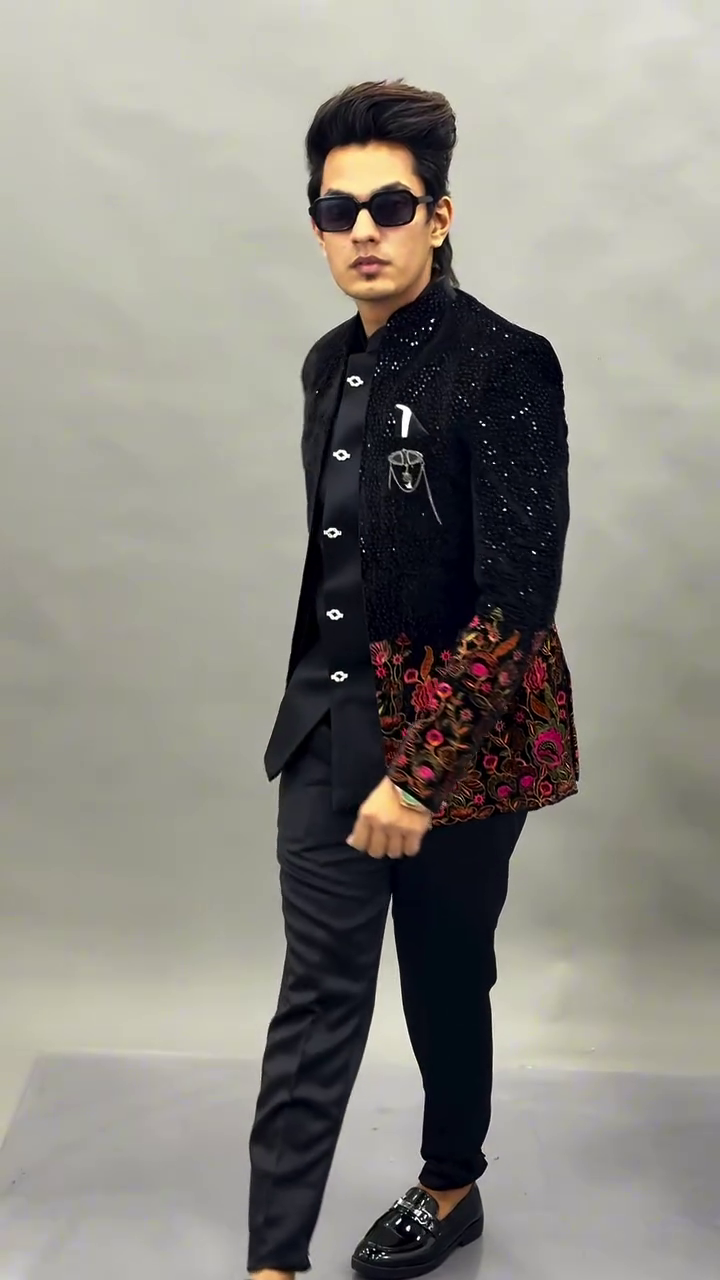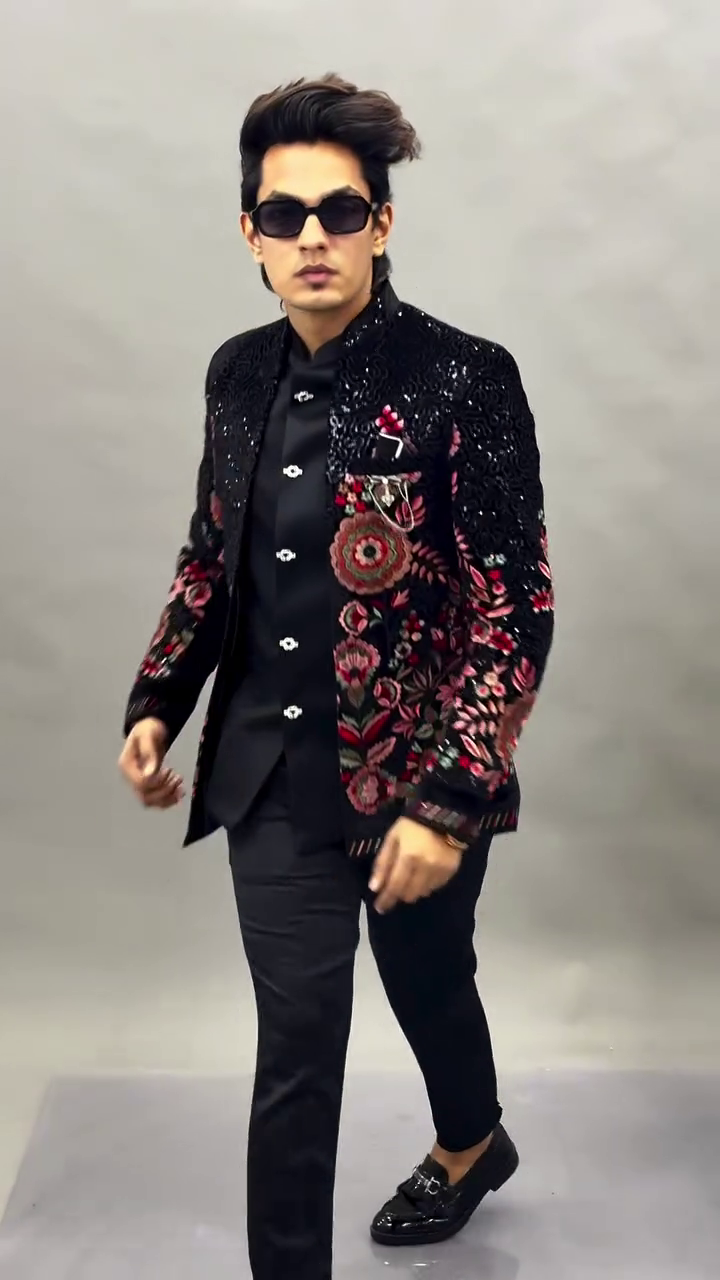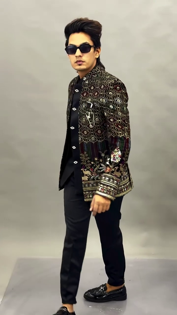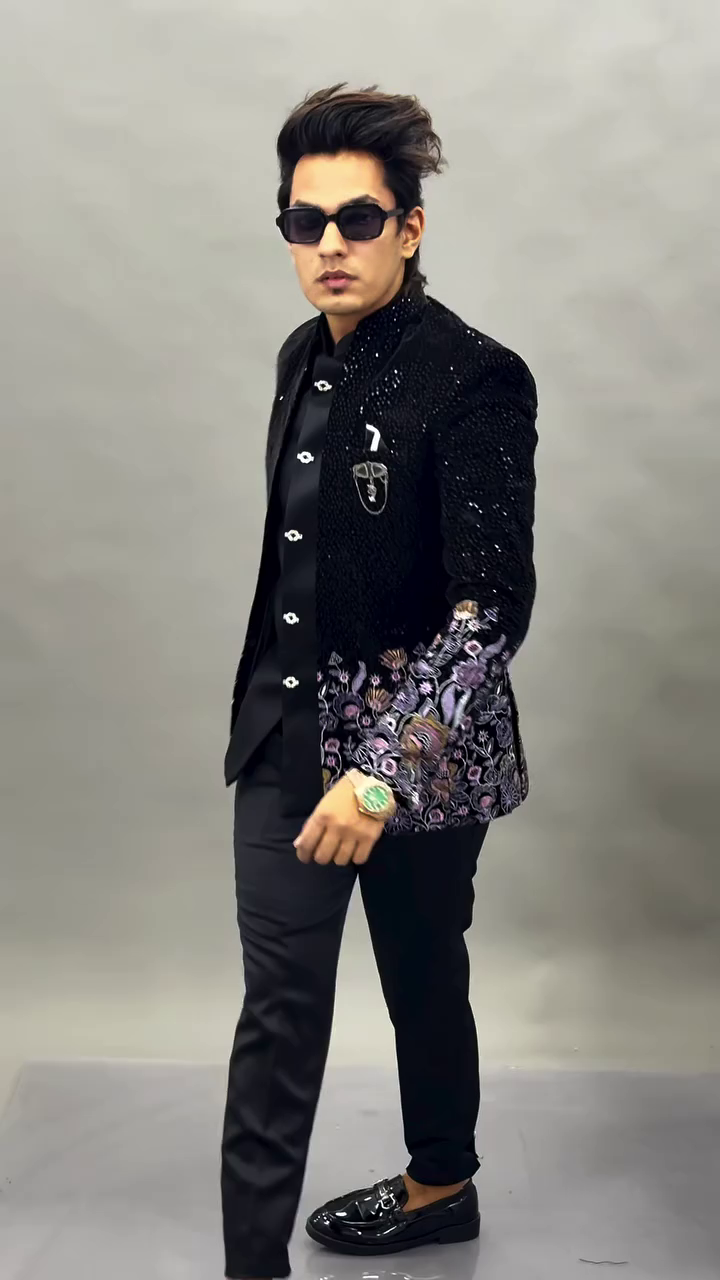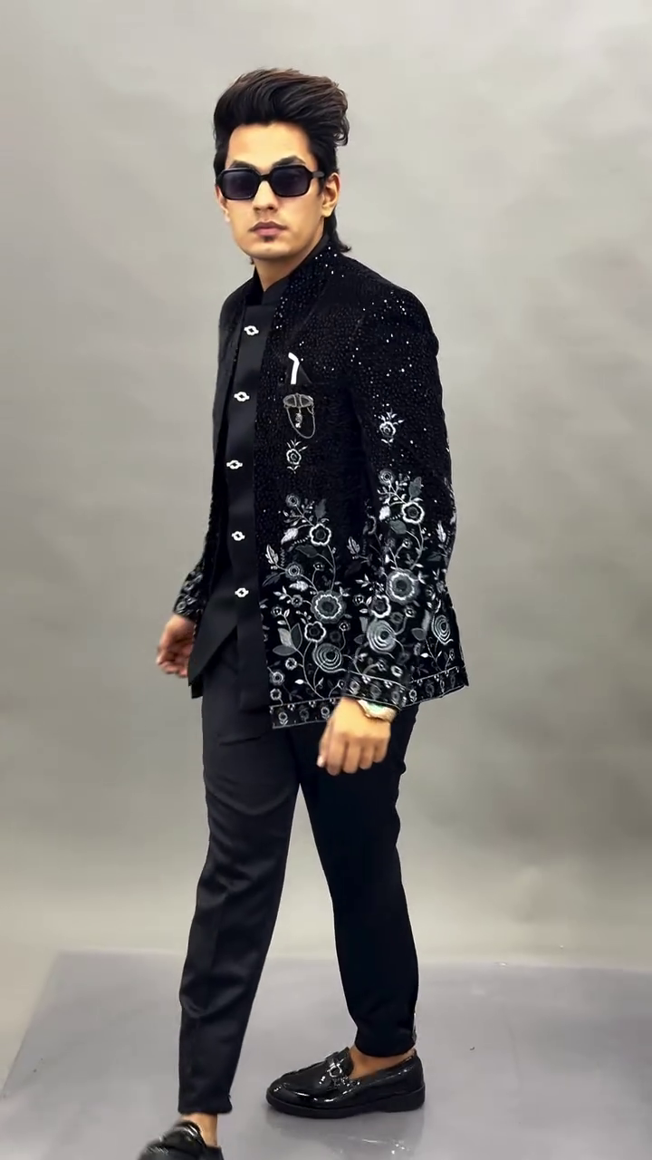 The centerpiece of this look is the intricately embellished black jacket, crafted with a luxurious textured finish that catches the light beautifully. The subtle shimmer across the fabric adds depth and richness, while the detailed floral embroidery along the sleeves and lower panels introduces an artistic and regal touch. The contrast of the embroidery against the deep black base creates a visually captivating effect, making the jacket the highlight of the entire outfit.
