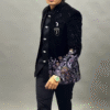 Underneath, a sleek black shirt with a structured design complements the jacket perfectly. The minimal detailing on the shirt allows the outer layer to shine while maintaining a cohesive and polished appearance. The monochromatic styling enhances the outfit’s sophistication, proving that black-on-black can be both powerful and elegant when executed with precision.