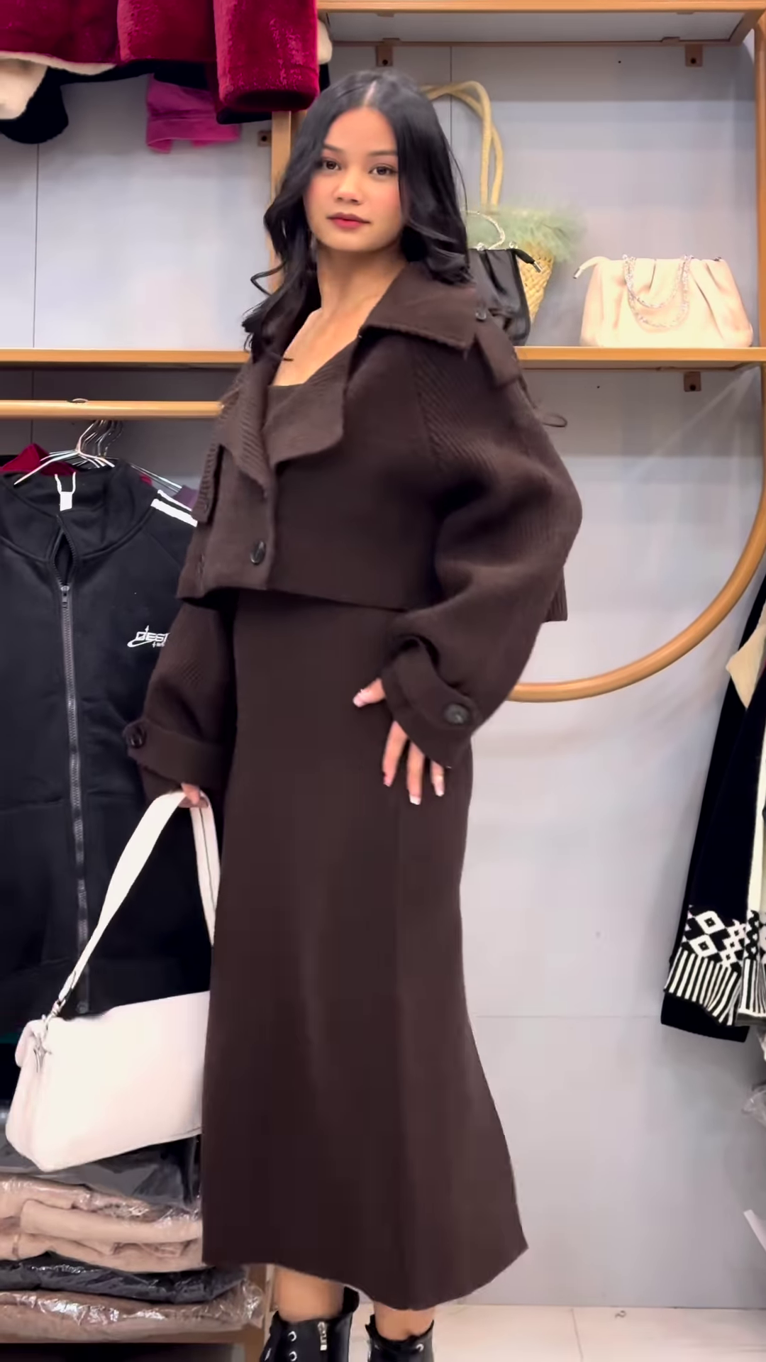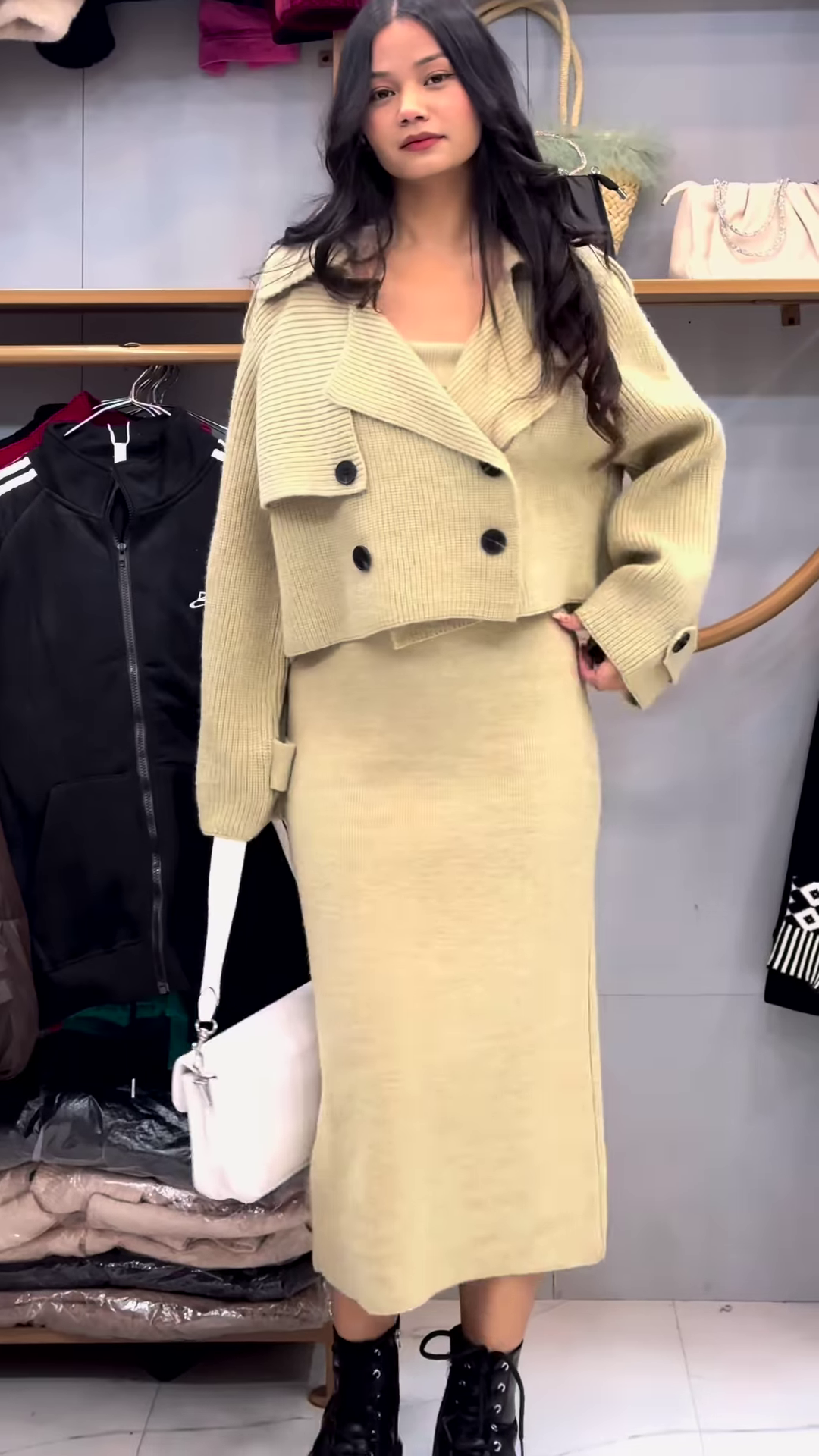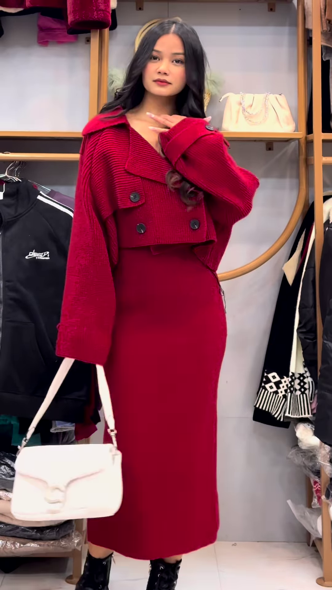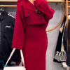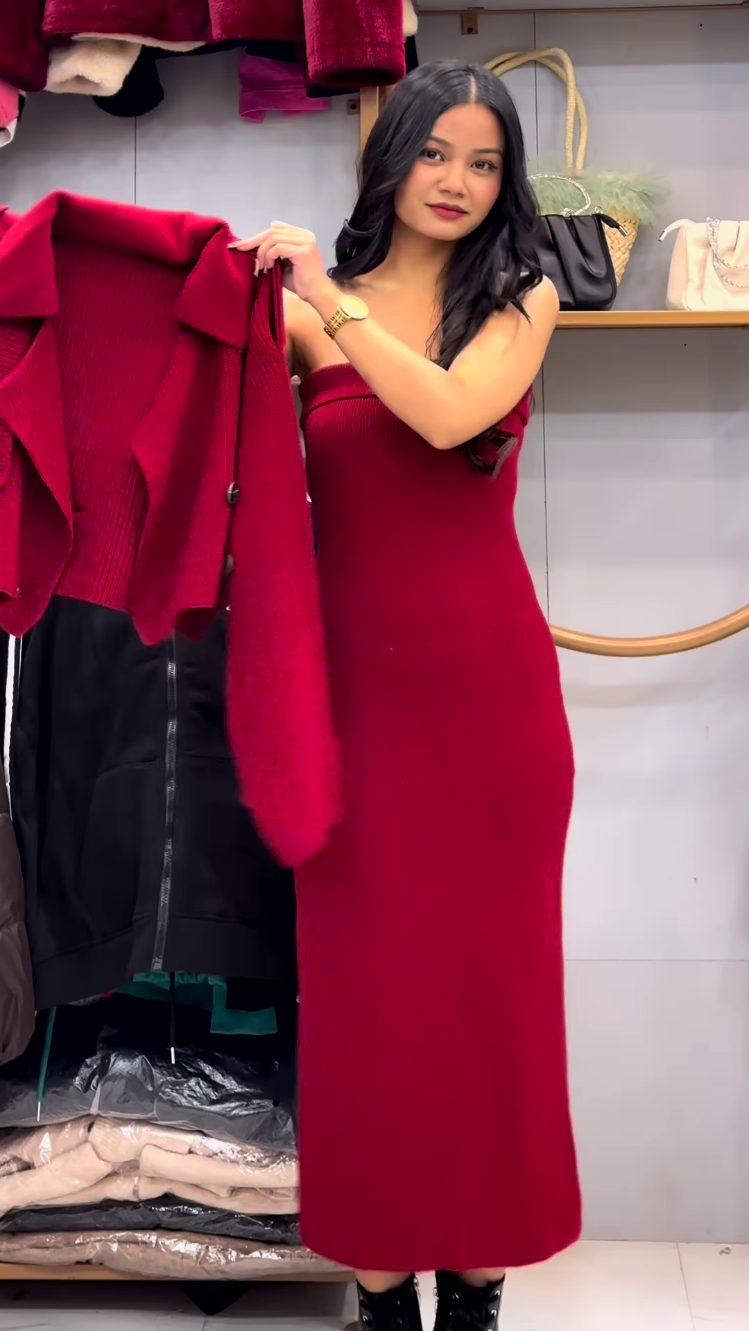 A **knitted red cardigan and tube dress set** is a perfect cozy yet chic choice for the cooler season. Here’s how you can style and enhance this trendy look:
