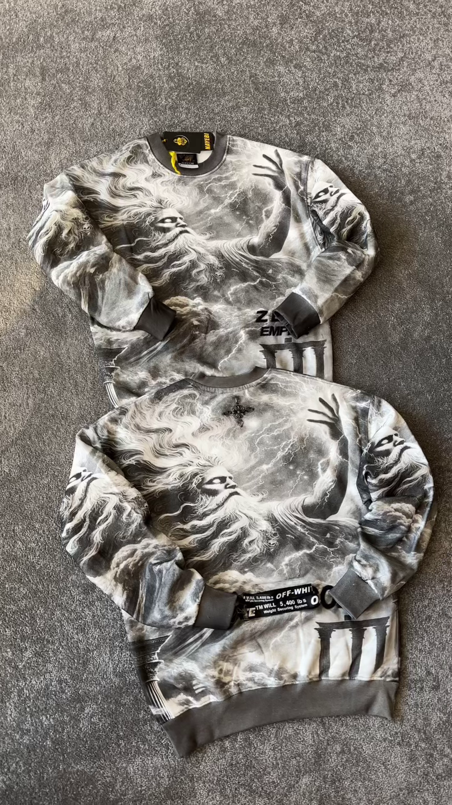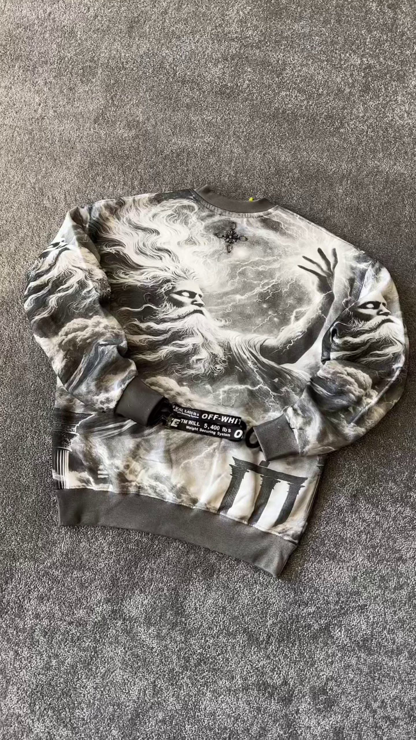 The design is inspired by dark fantasy and street fashion aesthetics πŸŒͺοΈπŸ–€. With cloudy storm patterns, lightning effects, and a dramatic face print on the front and sleeves, it looks absolutely premium and different from basic sweatshirts. The grey-black tone blend makes it super stylish and easy to match with any outfit β€” jeans, cargos, joggers, or even shorts πŸ‘–βœ¨.