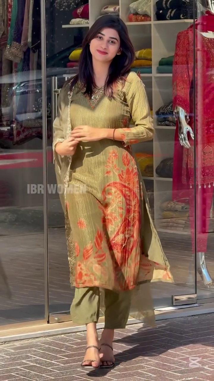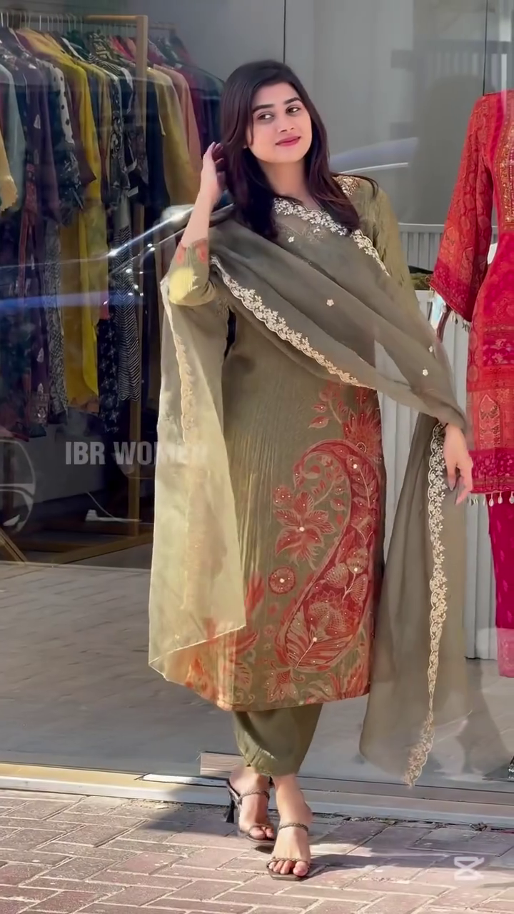 The **Printed Crape V-Neck Embroidery Kurta and Pant with Chinon Dupatta Full Suit Set** is an exceptional blend of modern design and traditional elegance, perfect for those who seek a versatile and fashionable ethnic outfit. Here’s an in-depth look at the details and features of this stunning ensemble: