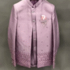 Adding to its charm is the stylish brooch detail on the chest pocket. This accessory introduces a hint of contemporary flair, making the sherwani feel current and fashion-forward while still honoring its traditional roots. The tailored fit ensures a sharp and flattering silhouette, enhancing the wearer’s presence with confidence and poise.