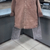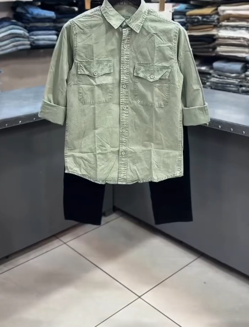 The highlight of this outfit is the washed brown shirt, which exudes a rustic and slightly worn-in character. Its faded finish gives it a vintage-inspired look, adding depth and personality to the overall design. The soft brown tone is both warm and versatile, making it easy to style across different seasons. The button-down front and structured collar maintain a polished appearance, while the rolled-up sleeves introduce a relaxed, laid-back vibe.