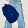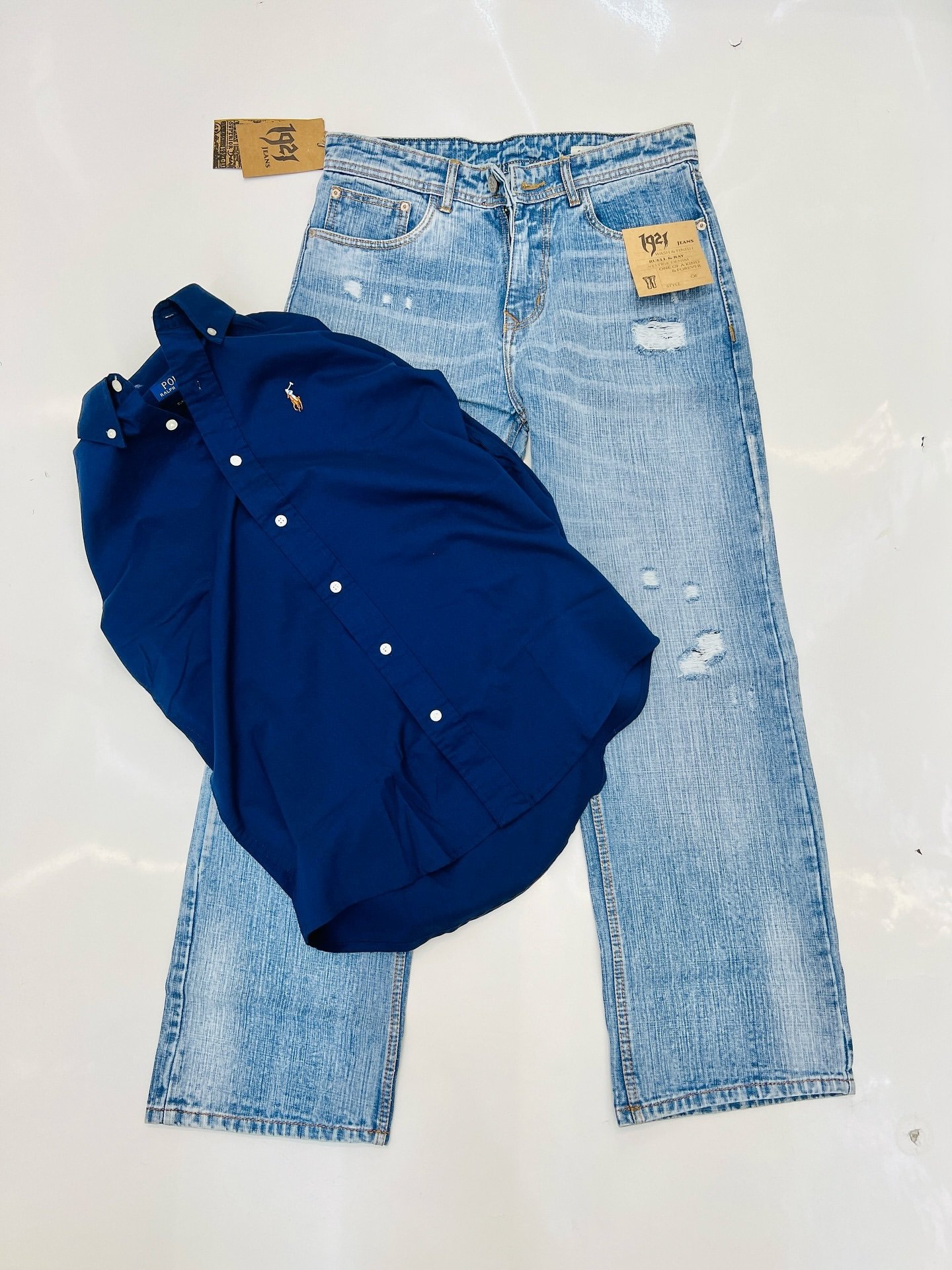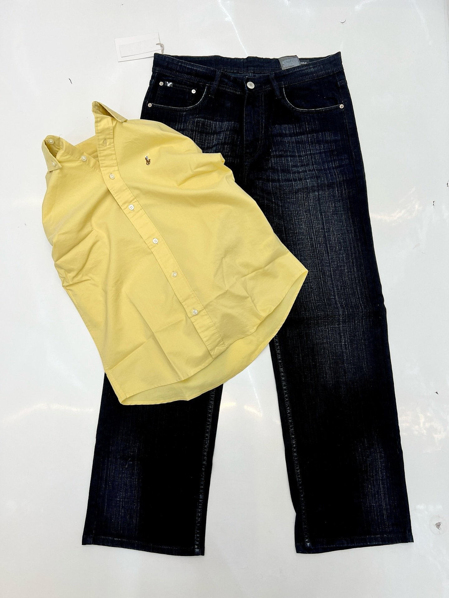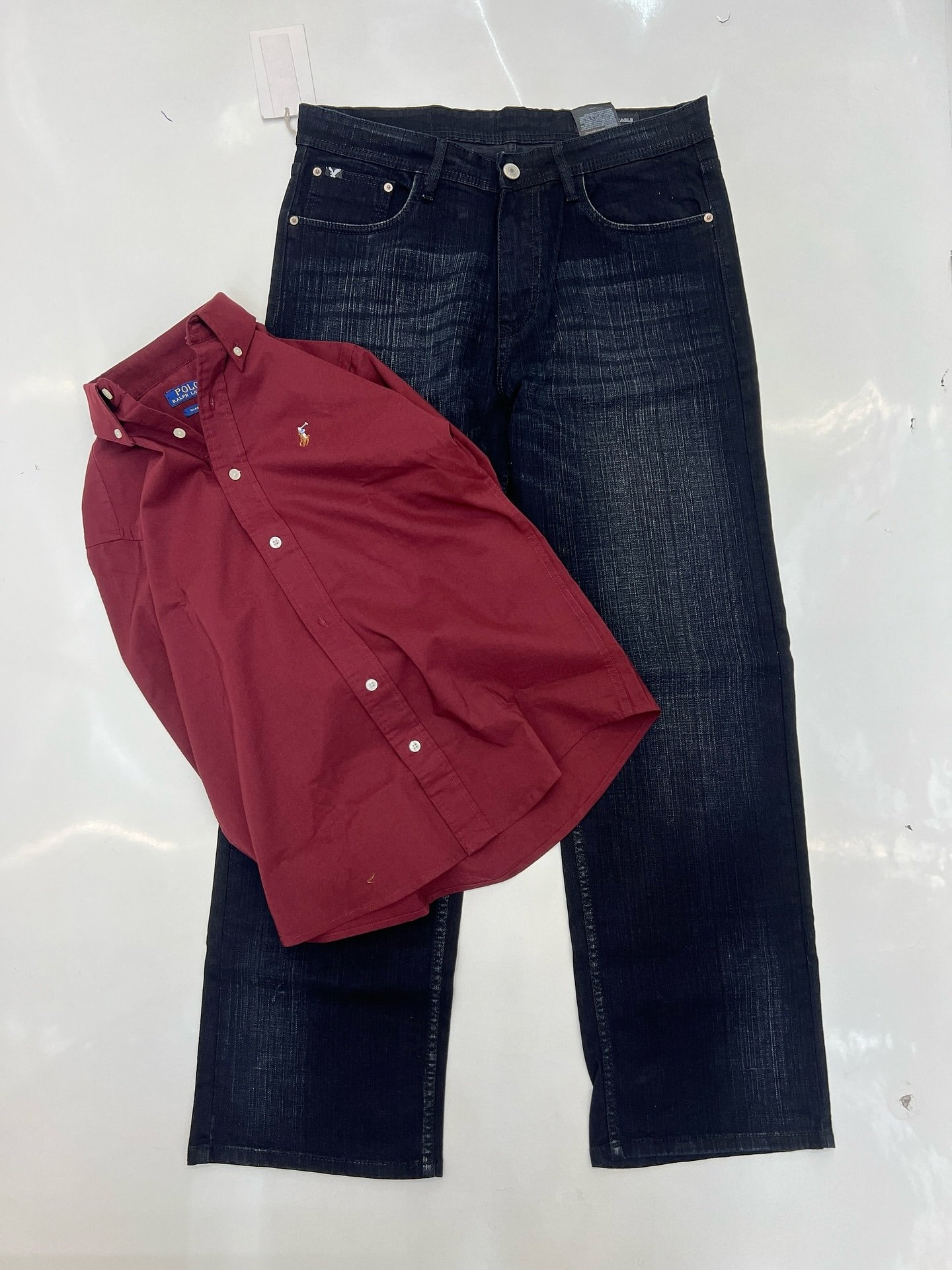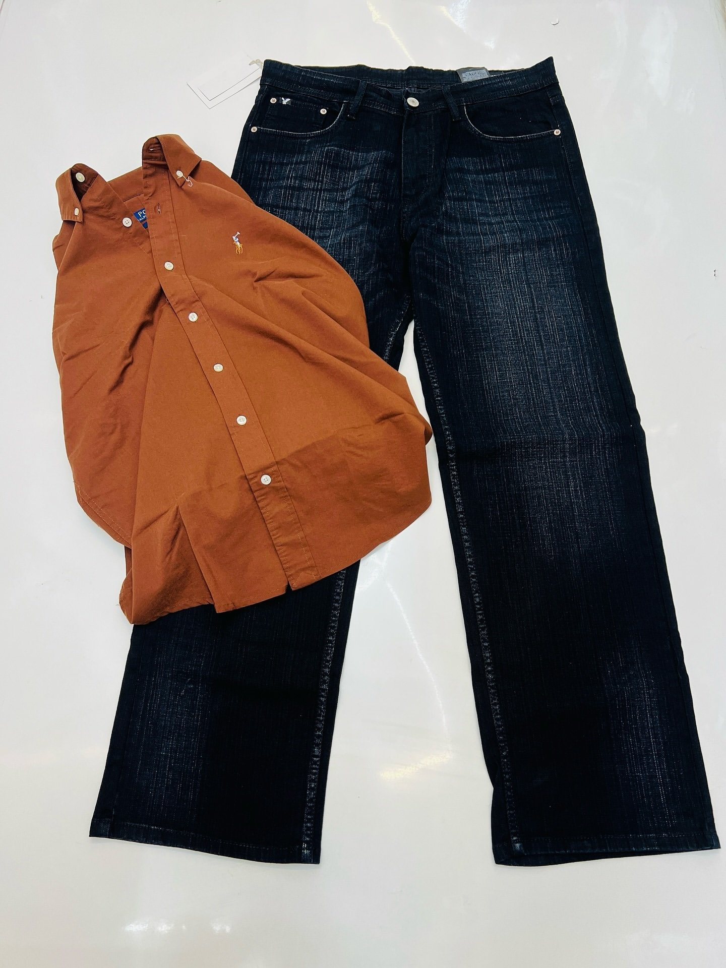 Complementing the shirt are the dark denim jeans, which bring depth and contrast to the outfit. The rich indigo tone adds a sleek and modern touch, making the overall look more dynamic. These jeans appear to feature a straight or slightly relaxed fit, offering both comfort and a clean silhouette. The classic five-pocket design and sturdy construction ensure durability while maintaining a timeless aesthetic.