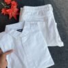Complementing the shirt are the crisp white bottoms, which provide a clean and striking contrast to the soft pink tone. The bright, neutral shade enhances the overall freshness of the outfit, creating a balanced and visually appealing combination. The structured design of the bottoms ensures a neat silhouette, making the outfit look refined and put-together.