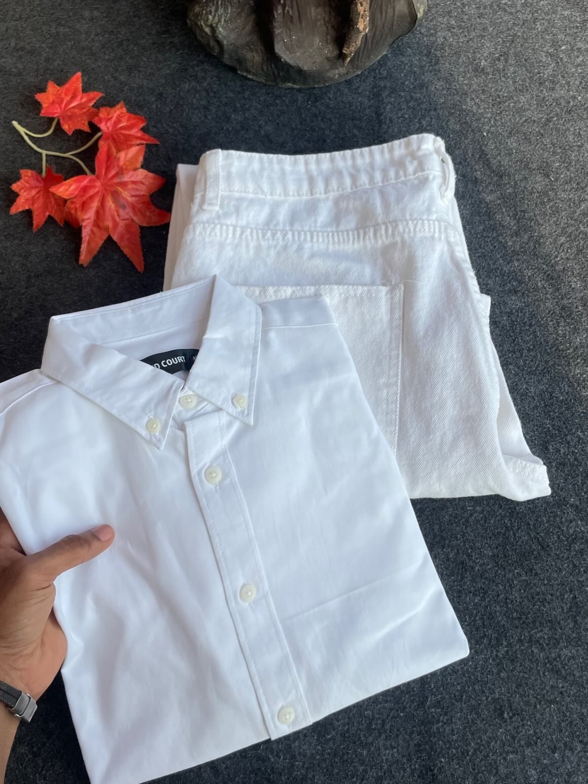 The addition of minimal decorative elements in the background, like the vibrant leaves, enhances the visual appeal and highlights the freshness of the outfit. It reinforces the idea that this look is perfect for those who enjoy clean, nature-inspired tones.