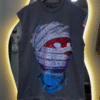 The dark charcoal base color of the tee enhances the vibrancy of the graphic, allowing the detailed artwork to truly pop. The blend of white, blue, and red tones in the design adds depth and dimension, giving it a dynamic and modern feel. The futuristic interpretation of the mummy motif, combined with abstract symbols and lines, creates a look that is both mysterious and fashion-forward.